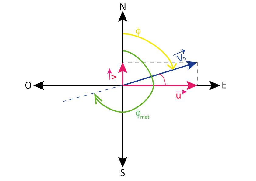 A continuación muestro un dibujo que hice con Adobe Illustrator (perdón por las curvas que ilustran los ángulos, que nunca me salen bien con Illustrator!). Como ves dibujé un eje cartesiano donde arriba está el Norte, abajo el Sur, el Este a la derecha y el Oeste a la izquierda. El vector velocidad horizontal es Vh, que como verás lo he descompuesto en sus componentes meridional y zonal v y u. Este es solo un ejemplo eligiendo un módulo, dirección y sentido cualquiera para el vector Vh.