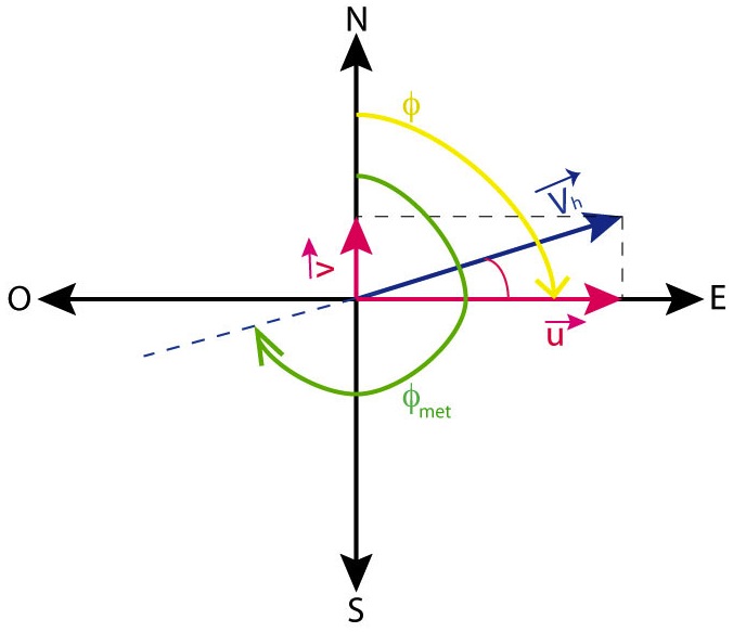 En nuestro sistema de referencia el Norte corresponde a 0º, el Este a 90º, el Sur a 180º y el Oeste a 270º. Lo primero que tienes que tener claro es que la dirección del viento se mide en grados desde el Norte (0º), en sentido de las agujas del reloj. Esto podría hacerte pensar que entonces la dirección del viento la marca el ángulo que he marcado en amarillo, pero no…..ojo, que hay algo más en la definición: la dirección del viento es aquella desde la que viene el aire, no hacia donde va. Recuerda que cuando decimos que hay viento de componente, por ejemplo, Este, no estamos diciendo que esté soplando hacia el Este, sino que sopla desde el Este. Por lo tanto, el ángulo que estamos buscando es el que dibujé en verde. Es así como se define la dirección del viento en meteorología (por eso le puse el «met» como subíndice al ángulo).