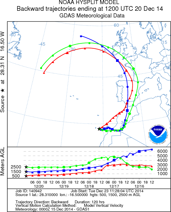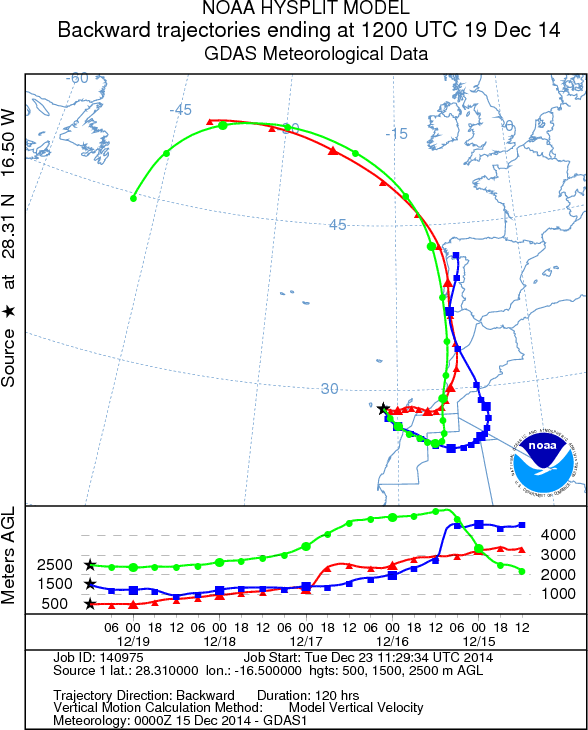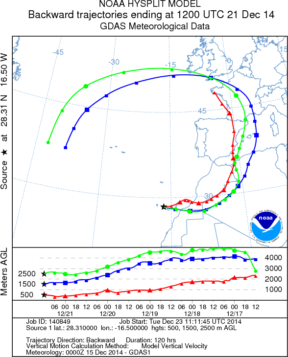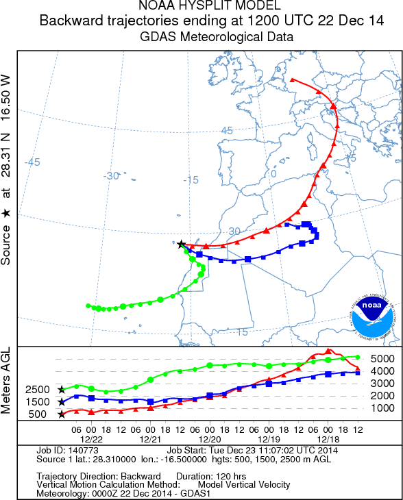 El origen africano de las masas de aire que están llegando desde el pasado día 19 a Canarias puede verse en estas retrotrayectorias calculadas con el modelo HYSPLIT. Las que se muestran están calculadas para 5 días hacia atrás, con llegada cada día a las 12 UTC en Tenerife a tres alturas: 500, 1500 y 2500 m s.n.m. A partir del día 21 ya está muy claro que las masas de aire, incluso las que tienen llegada a niveles bajos, han pasado por zonas que potencialmente son fuentes de polvo (frontera entre Norte de Sahara Occidental y Sur de Marruecos, Norte de Mauritania y Oeste de Argelia).