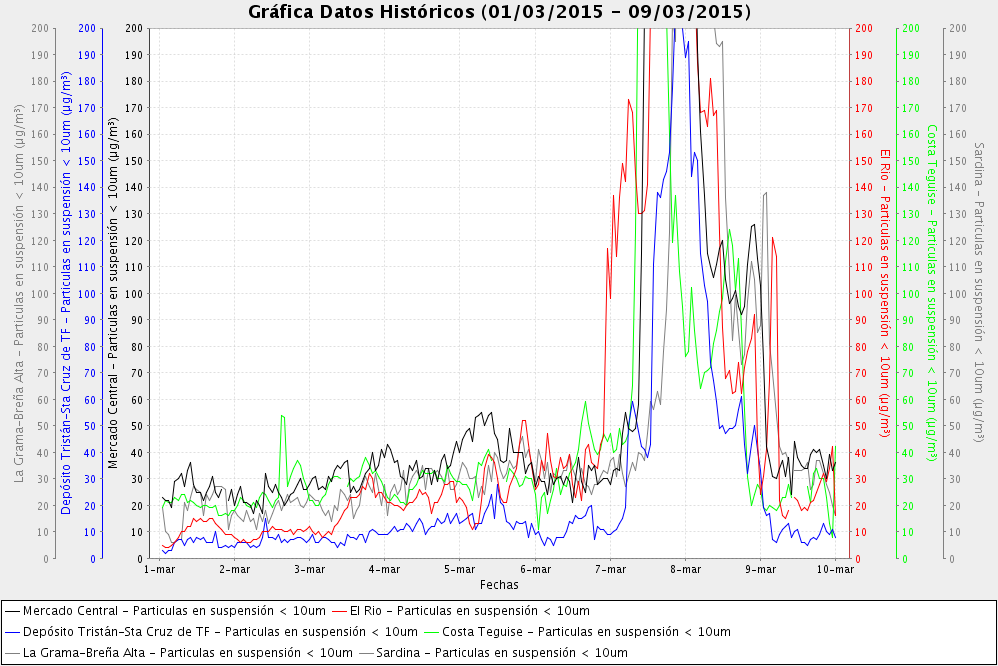 El 5 de marzo de 2015 comenzó un episodio de calima en Canarias que, en el momento en el que estoy escribiendo estas líneas, todavía no ha terminado, aunque ya es bastante menos intenso que hace unos días. En este post haré un pequeño resumen de este episodio desde el día 5 hasta ahora. Comenzaré comentando cómo han sido las concentraciones de PM10 (partículas con diámetro inferior a 10 micras) en algunas de las estaciones de las que la Red de Control y Vigilancia de la Calidad del Aire del Gobierno de Canarias proporciona datos.