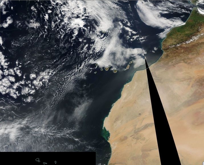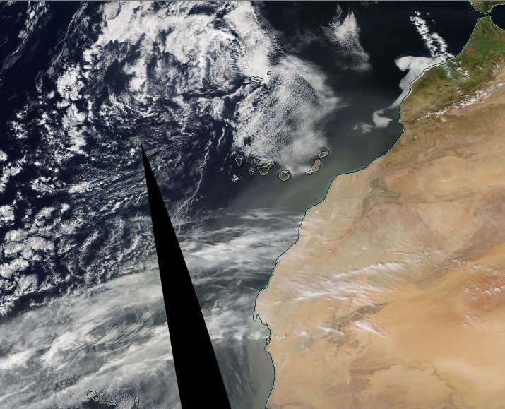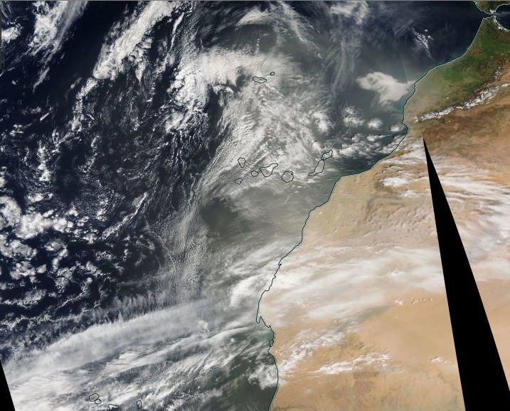 A continuación podrás ver una secuencia de imágenes tomadas por el sensor MODIS desde el satélite Aqua (NASA). En estas imágenes podrás ver cómo se forma un arco de polvo en el océano Atlántico que se internará en la Península Ibérica por su región Noroeste.