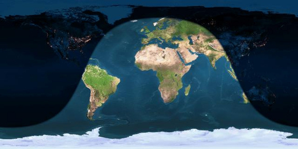 Es que allí era de día y no la pudieron ver, me podrías decir. Pues resulta que hoy, 25 de diciembre de 2015, la luna llena nos encontrará en buena parte del mundo (incluida España, donde se le ha dado tanta difusión a la noticia), de día. Estrictamente tuvo lugar unos minutos antes de escribir yo estas líneas, a las 11:11 UTC. Si te fijas en el mapa que reproduzco a continuación verás qué zonas estaban iluminadas por el Sol a esa hora y cuáles no.