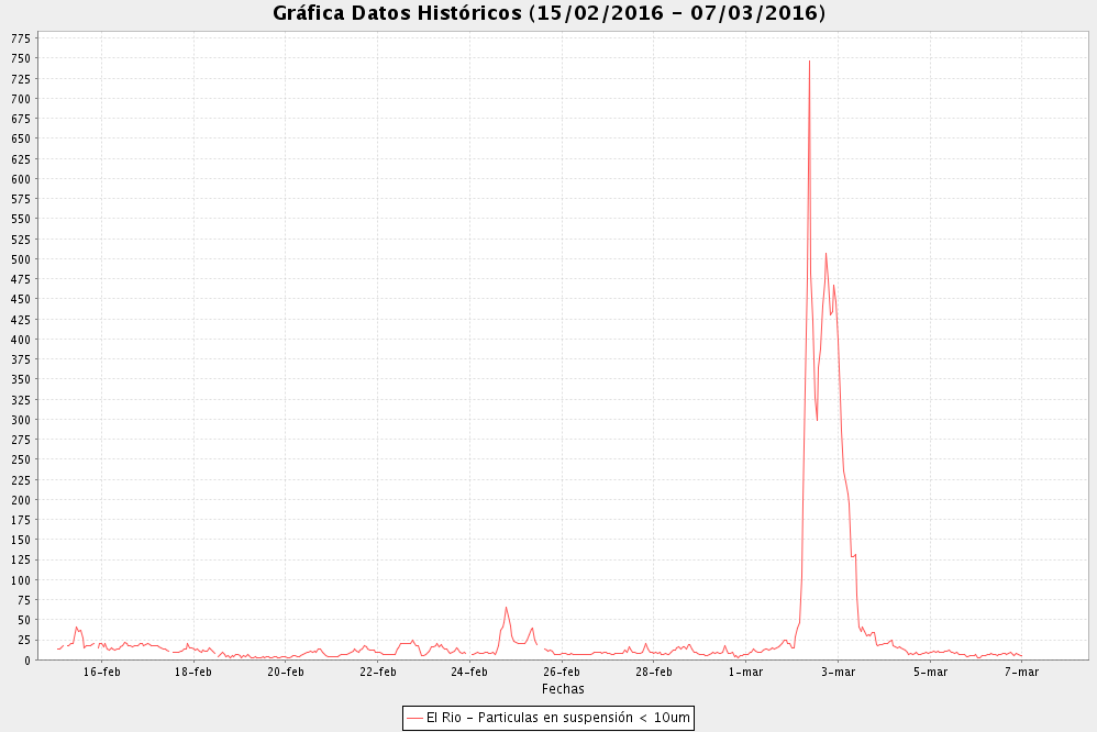 Para que te hagas una idea de la intensidad de esta intrusión de polvo, el promedio diario de PM10 (concentración de partículas con diámetro inferior a una micra) en la estación de El Río (Tenerife, a 500 m s.n.m.) fue de 348 microgramos por metro cúbico (dato extraído de la web de la Red de Control y Vigilancia de la Calidad del Aire del Gobierno de Canarias). Aquí puedes ver una serie horaria de datos de concentración de PM10 en El Río desde el 15 de febrero hasta el 7 de marzo. El día 2 de marzo se registró un pico de nada más y nada menos que 747 microgramos por metro cúbico.
