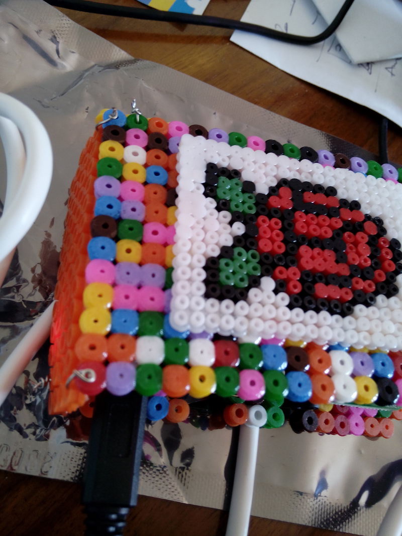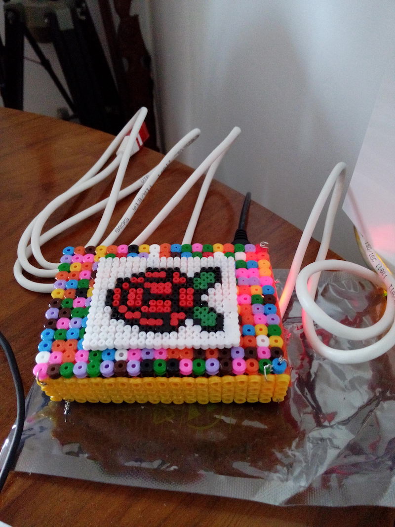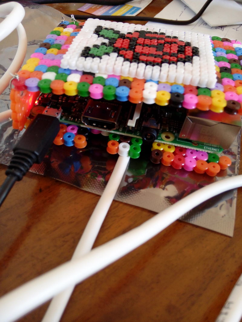 Para proteger esta pequeña placa-ordenador tienes dos opciones, comprar una caja de las que pueden encontrarse fácilmente en el mercado, o hacer una. El ordenador es tan pequeño que con cualquier cajita de cartón a la que puedas hacer unas cuantas aperturas para los conectores te servirá. Por internet también puedes encontrar plantillas para imprimir y montar una caja. Yo me quise dar el capricho de hacer la caja yo misma con material que suelo usar para manualidades: cuentas de colores de tipo Hama Beads. La caja está hecha con las Pysslas que se compran en Ikea, y el adorno con el logo de Raspberry Pi lo hice con otras de un tamaño más pequeño, compradas en tiendas de productos chinos. Esta es una primera versión, con dos laterales al aire para poder extraer la tarjeta más cómodamente mientras sigo probándola, pero no descarto mejorarla.